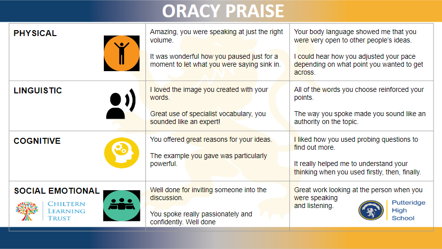 You will have already found a copy of the oracy praise card in your pidgeon hole (a little late valentines present from English!) Praising students consistently and liberally for demonstrating oracy skills is an excellent way to both raise student awareness of these skills and also motivating them to use them more frequently. The oracy praise card can be kept in your planner or on your desk, or laminated and added to a keyring and provides you with the language to use when giving students positive feedback on their oracy in the classroom.
