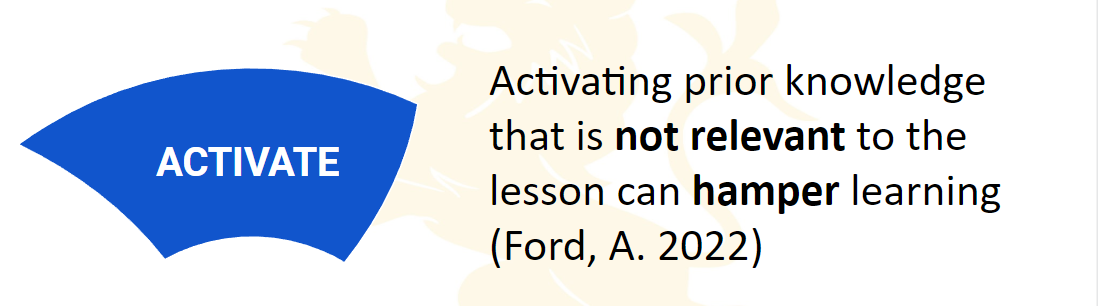 On 23rd February, Amber shared ideas for using retrieval practice to activate learning. Activating prior knowledge that is not relevant to the lesson can hamper learning (Ford, A. 2022), so it’s important to ensure that retrieval practice used in the Activate Stage of the lesson is carefully planned.
