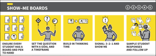 It is essential that all students hold up an answer and it is imperative to respond immediately - you can do this by asking students to justify correct answers, ‘How did you get there?’ and ‘What was your thought process?’ - this is a good one to model disciplinary thinking. You can also challenge incorrect answers by asking, ‘Can you explain where you went wrong? Look out for common misconceptions in the answers - do a number of students have the incorrect answer? Do you need to reteach a component? It's very useful to combine show me boards with Think-Pair-Share so that students can work with their peers to collaborative on finding an answer before sharing their joint response with the teacher and class and, importantly, before they permanently commit to an answer by putting pen to paper in an exercise book.
